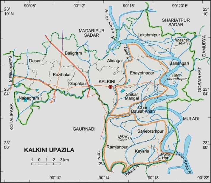 কালকনি থানা একটি পরিবর্তিত নাম । মাদারীপুর মহকুমার উজানে পদ্মা নদী আ দক্ষিণে মেঘনা নদীর মধ্যস্থল ভাগের সংযোগে রক্ষাকারী আড়িয়াল খা নদী। কালকিনি ভৌগোলিক অবস্থানে এ অঞ্চলের ভূ-গঠনে প্রবাহিত নদীগুলোর ভূমিকা অত্যান্ত গুরুত্বপূর্ণ । কালকিনি থারার ভূ-ভাগের মধ্যে দিয়িআড়িয়াল খা নদী, পালদী নদী, গজারিয়া নদী, কাচিকাটা -তুলাতলা নদী স্নানঘাটা নদী(ছোট গাঙ) এবং টেংরা নদীর সিকস্তি ও চরাঞ্চল এলাকায় বেলে মাটির আধিক্য অত্যান্ত বেশি